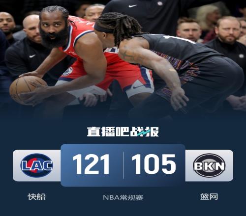 比赛开场,篮网陷入得分荒,哈登则状态火热单节砍下15分,带领快船开场打出一波16-2,首节结束35-25领先。次节回来,快船延续进攻势头,再打出一波小高潮领先到20分,篮网这边波特外线失准,半场结束快船63-47领先。易边再战,哈登延续进攻状态,双方陷入拉锯战,交替取分,分差在15分上下浮动,三节结束快船91-76领先。末节回来,小卡开始发力,进攻端予取予求,分差很快再次来到20分,比赛结果盖棺论定,快船121-105轻取篮网。
