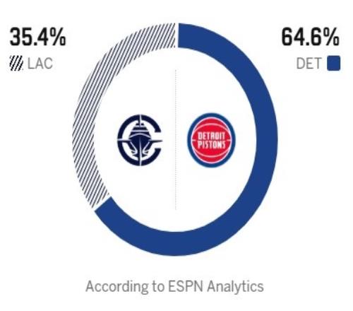 ESPN预测本场比赛胜率:快船35.4%,活塞64.6%。